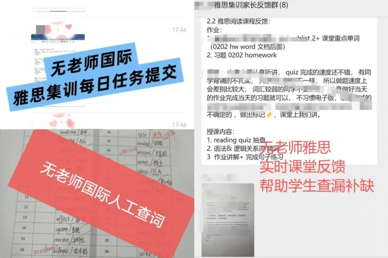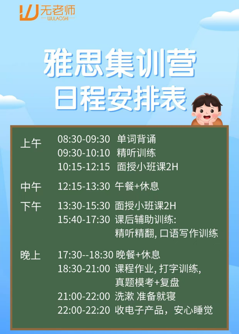 强大的师资力量是集训营质量的根本保障。无老师的授课老师全部都是9-14年雅思授课经验,业内顶尖级别老师,深受班课和一对一学员欢迎的经验丰富的教师团队,具备深厚的教研功底与丰富的教学经验。他们熟悉考试动态,深谙评分标准,能够为学员提供最专业的指导。除了授课老师,专业的助教团队也提供全程督学服务,每天早8:30--21:00, 包括4H正课+4H训练+2H模考(课后辅助训练)。从早读的单词检查到晚自习的作业辅导,助教老师时刻关注着学员的学习状态,及时答疑解惑,并与家长保持沟通,形成家校合力,确保学习效果落到实处。